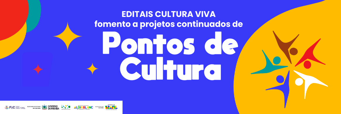 O Governo do Estado da Paraíba, por meio da Secretaria de Estado da Cultura torna público o presente Edital para o desenvolvimento da “REDE ESTADUAL DE PONTOS DE CULTURA DA PARAÍBA” por meio da Política Nacional de Cultura Viva (PNCV), instituída pela Lei nº 13.018, de 22 de julho de 2014. O presente edital é regido pelo disposto na Lei nº 14.399/2022 (Política Nacional Aldir Blanc D), no Decreto nº 11.740/2023, Portaria MinC nº 200/2025, Portaria MinC nº 206/2025 (Regulamentam a PNAB), na Lei nº 13.018/2014 (Política Nacional de Cultura Viva), na Instrução Normativa MinC nº 1/2015, e na Instrução Normativa MINC nº 12/2024, ou em ato normativo correspondente em vigor (Regulamentam a PNCV), aplicando-se também, no que couber, como complementação em situações não previstas na Política Nacional de Cultura Viva, o Decreto nº 11.453/2023 (Decreto de Fomento) e o Marco Regulatório do Fomento à Cultura nº 14.903/2024. Este Edital é realizado com recursos do Governo Federal repassados pelo Ministério da Cultura, por meio da Política Nacional Aldir Blanc de Fomento à Cultura. Aqui você vai encontrar as regras deste edital e como fazer para inscrever seu projeto. Estamos muito felizes com seu interesse em participar desta política. Boa leitura.